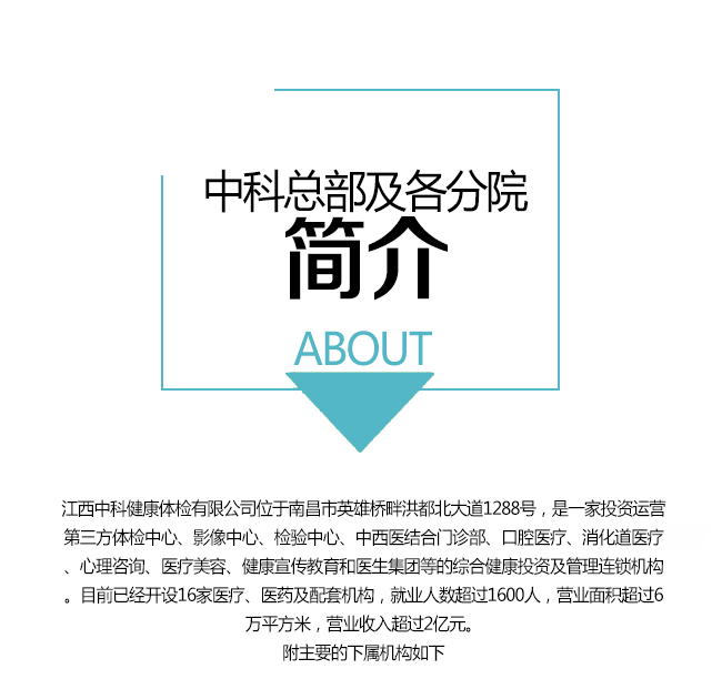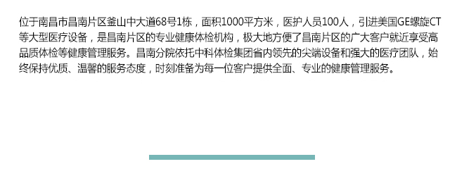 江西中科健康體檢中心位于南昌市洪都北大道1288號(洪都大橋引橋下),交通便利,環境優美,實用面積8000平方米,車位200余個。江西省目前專業化程度高、規模大、設備先進、檢查項目齊全的健康體檢和健康咨詢服務機構。